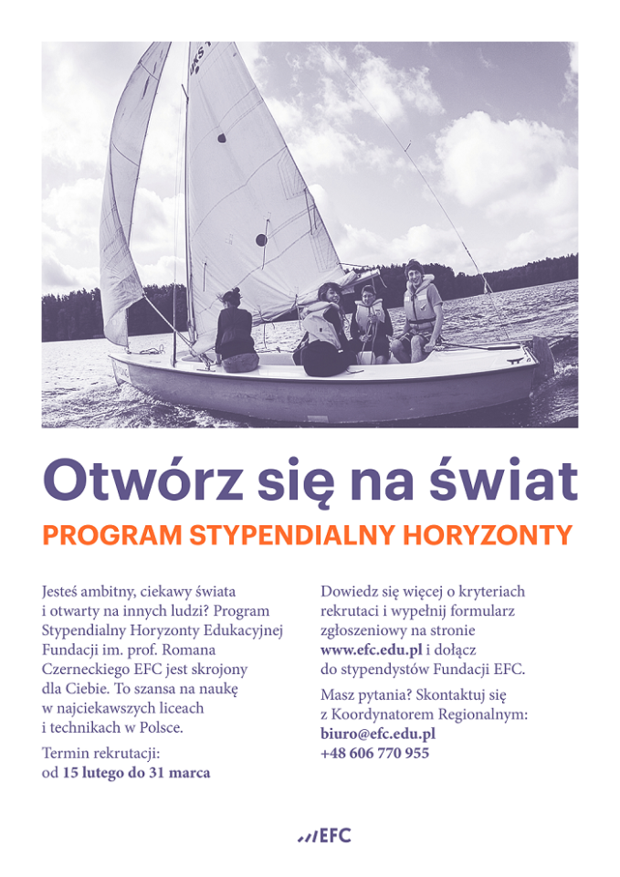 Zachęcamy uczniów do wypełnienia formularza zgłoszeniowego online na stronie Fundacji między 15 lutego a 31 marca. Horyzonty to unikatowe doświadczenie, które pomaga uczestnikom rozwinąć skrzydła i otworzyć się na świat. Więcej informacji na temat rekrutacji oraz programu stronie internetowej Fundacji EFC, www.efc.edu.pl.