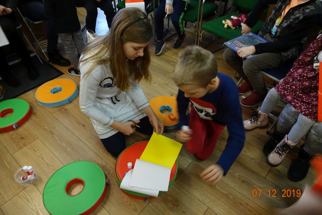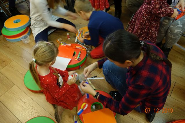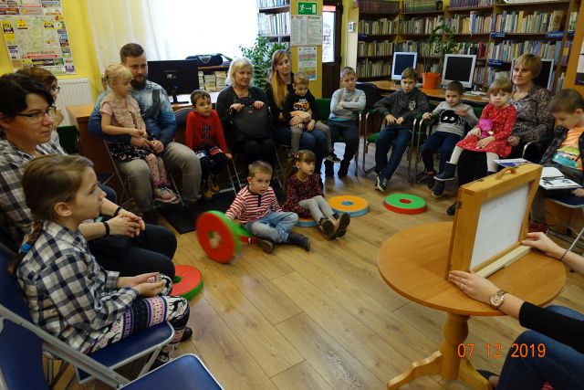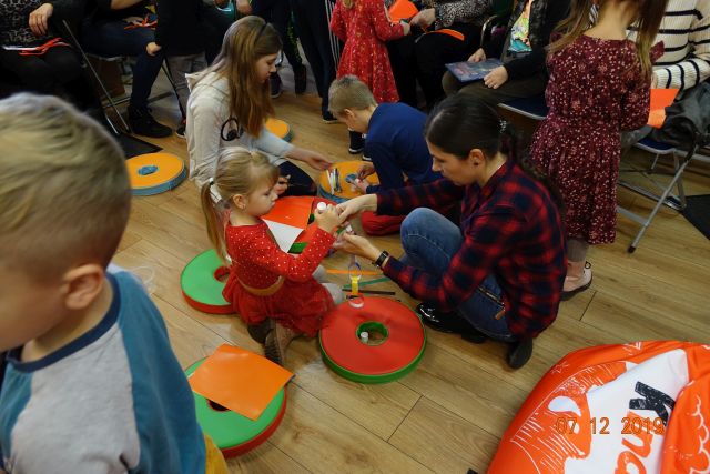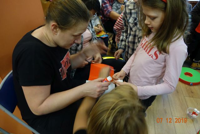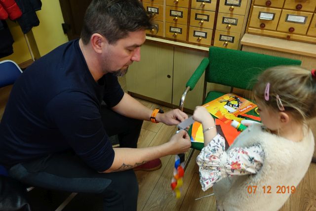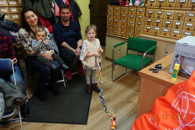 W oczekiwaniu na Mikołaja, wysłuchały świątecznej opowieści zaprezentowanej w formie teatrzyku kamishibai oraz listu, który specjalnie do nich skierował pan z białą brodą. Dzieci wspólnie z rodzicami i babciami rozwiązywały zagadki, a następnie z zapałem zabrały się do pracy i szybko powstał bardzo długi i kolorowy łańcuch na choinkę, który można obejrzeć w bibliotece. Pięknie przyozdobił regały biblioteczne.