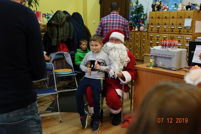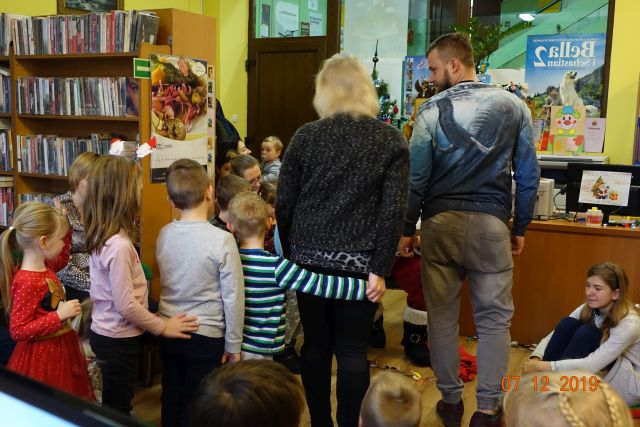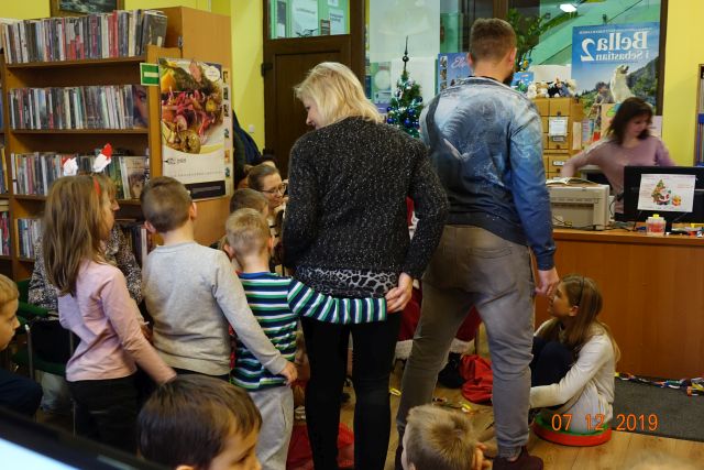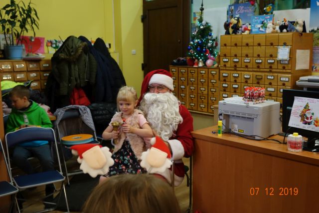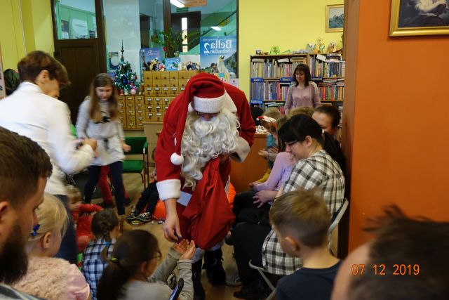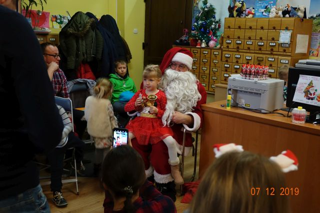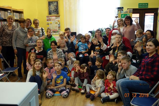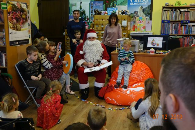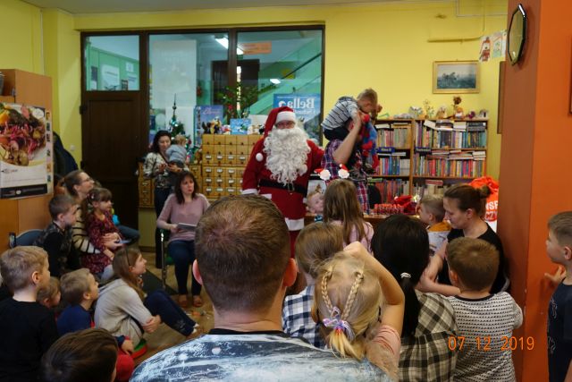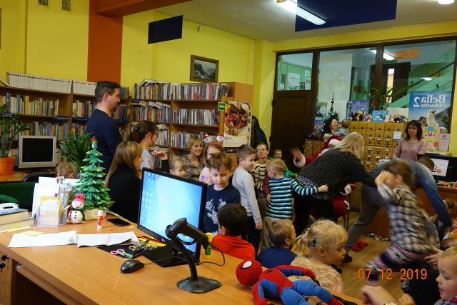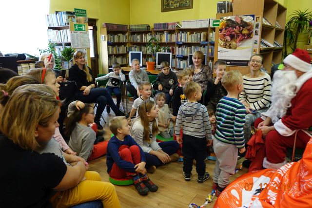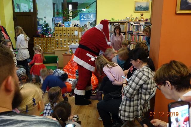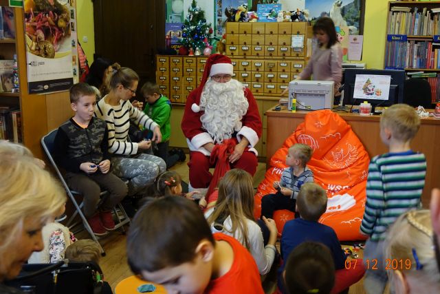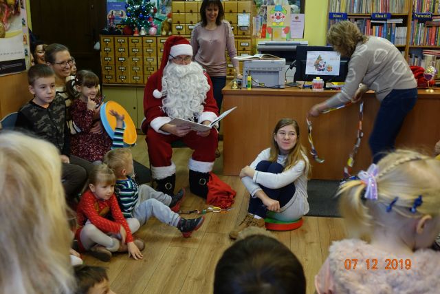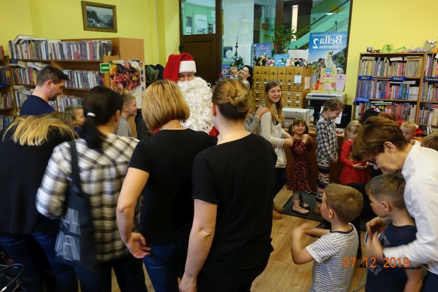 Mikołaj przybył z wielkim workiem słodyczy, którymi obsypał najmłodszych, a następnie zaprosił wszystkich do wspólnej zabawy. Było wyrywanie „Rzepki” i „Lokomotywa”, przejeżdżająca między regałami pełnymi książek. Na zakończenie każde dziecko mogło sfotografować się z Mikołajem.