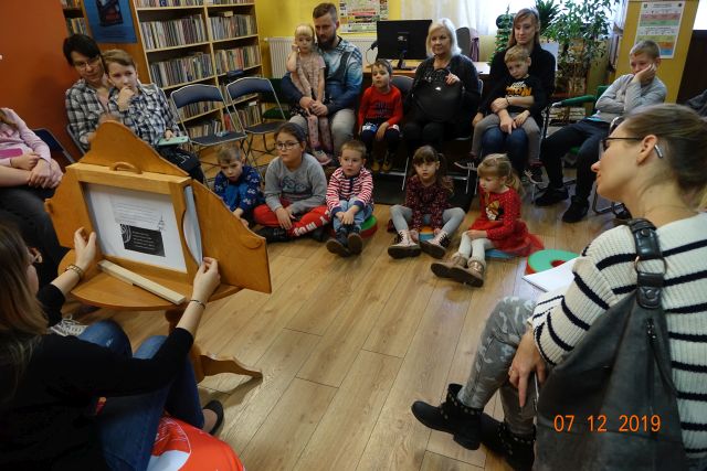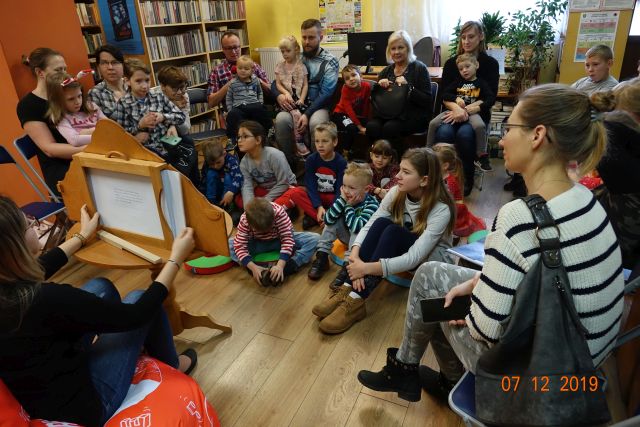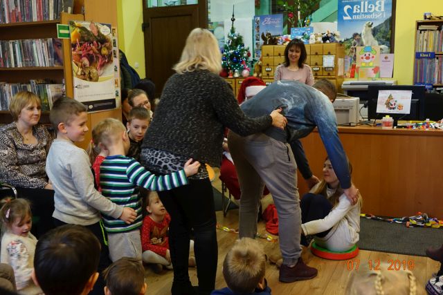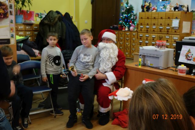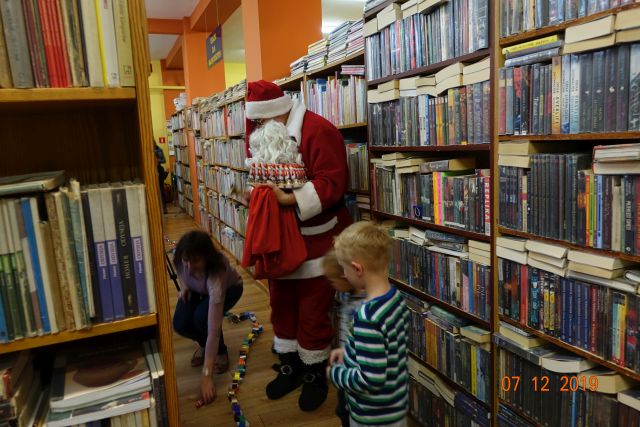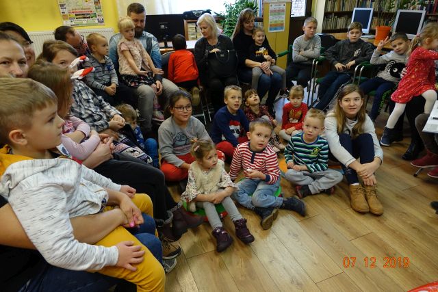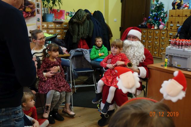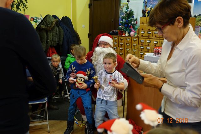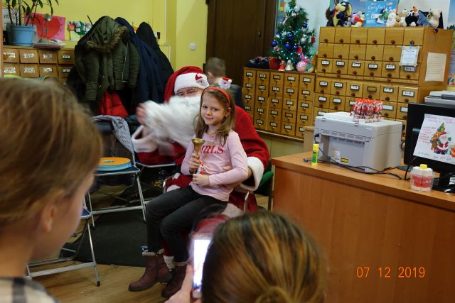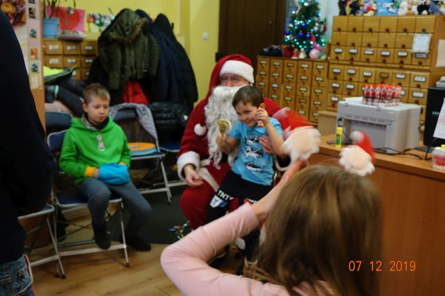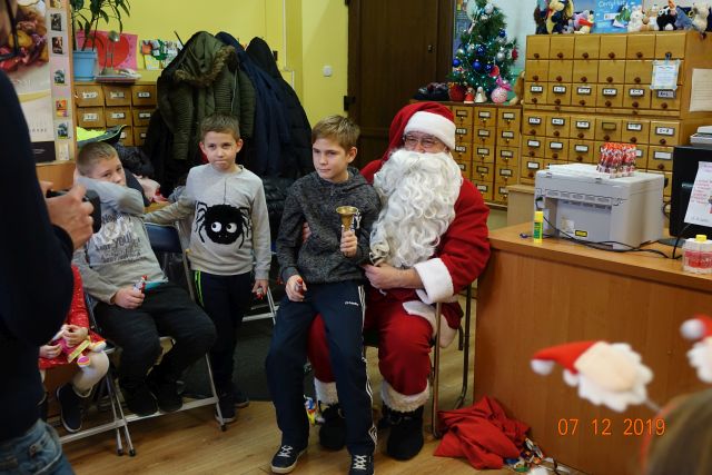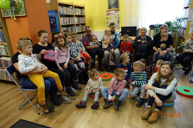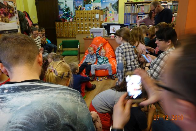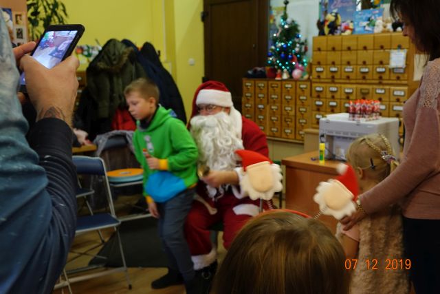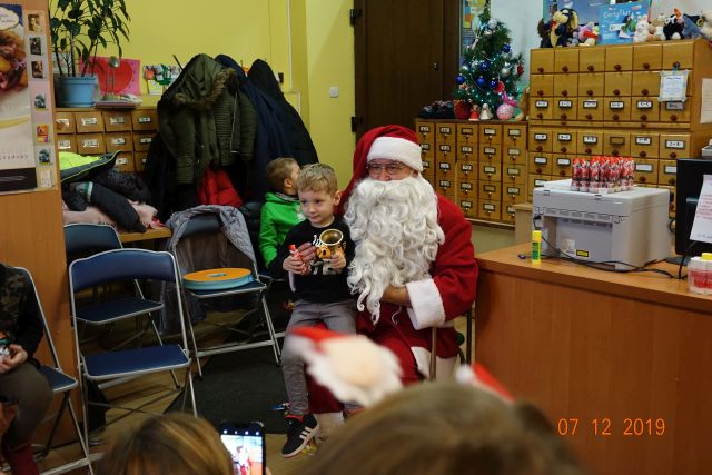 Mikołaj przybył z wielkim workiem słodyczy, którymi obsypał najmłodszych, a następnie zaprosił wszystkich do wspólnej zabawy. Było wyrywanie „Rzepki” i „Lokomotywa”, przejeżdżająca między regałami pełnymi książek. Na zakończenie każde dziecko mogło sfotografować się z Mikołajem.