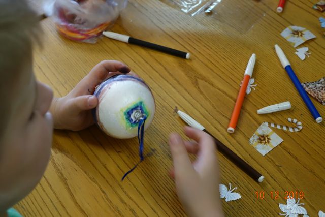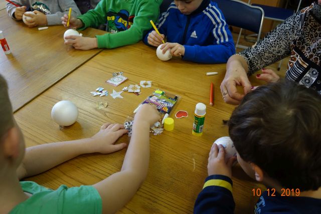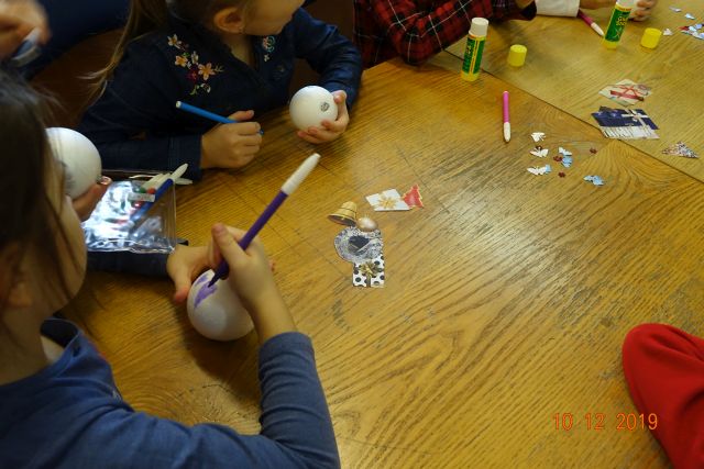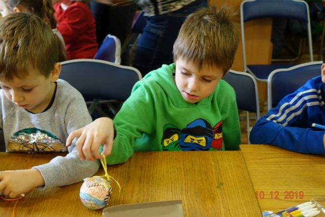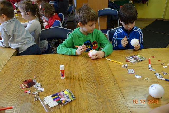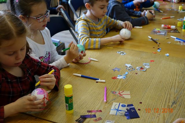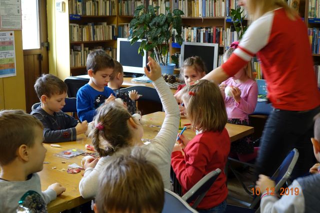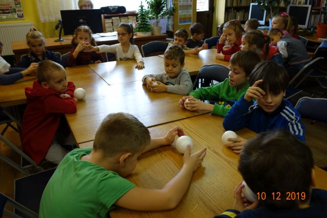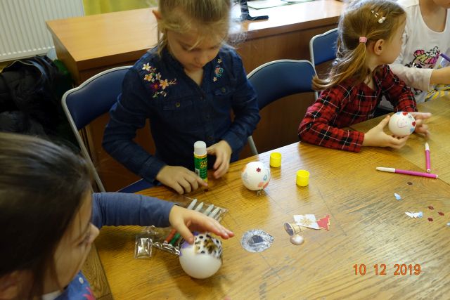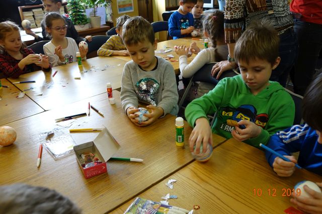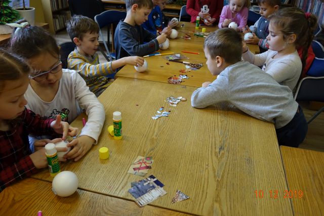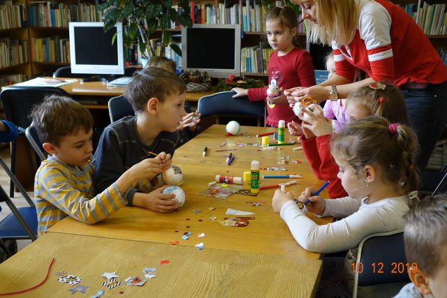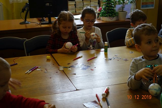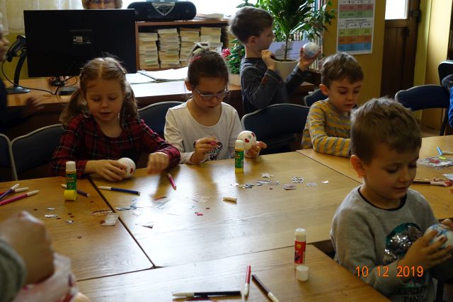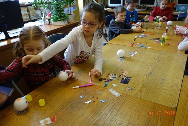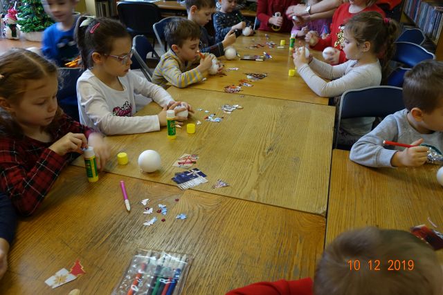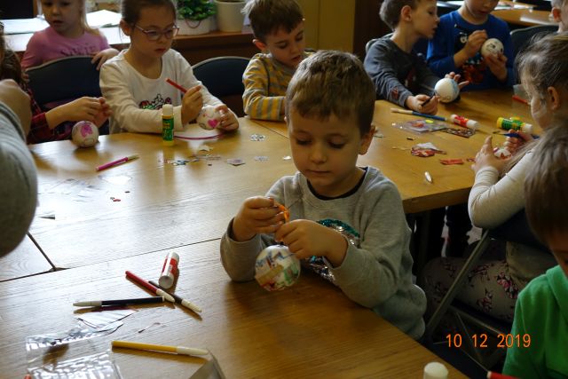 Pracowite aniołki to tytuł opowiadania z książki Wielka świąteczna księga, którego podczas kolejnego spotkania w bibliotece, 10 grudnia, wysłuchały Pszczółki z Przedszkola nr 1 z Oddziałami Integracyjnymi w Słupcy. Tematyka świąteczna opowiadania zainspirowała nas do wspólnego dekorowania bombek świątecznych. Dzieci, wykorzystując różne techniki (od rysunków, po wyklejanki), pięknie przyozdobiły bombki, które zdobią pomieszczenia biblioteki.
