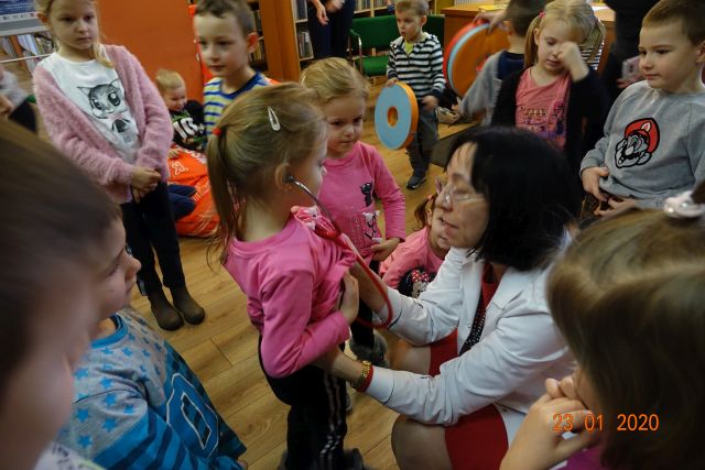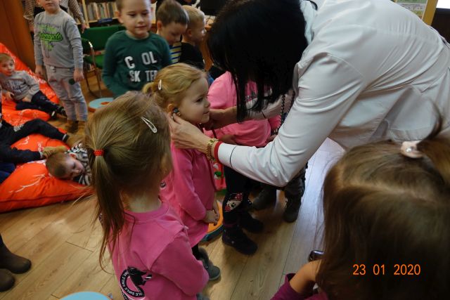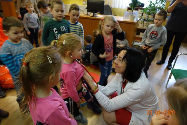 Pani doktor zapoznała dzieci z zawodem lekarza, opowiedziała im o swojej trudnej pracy. Przedszkolaki miały niepowtarzalną okazję do samodzielnego posłuchania bicia własnego serca przez stetoskop. Spotkanie upłynęło w bardzo miłej atmosferze.