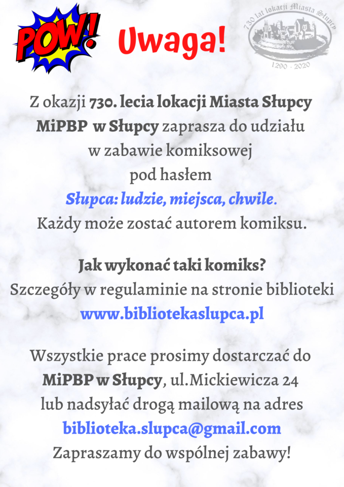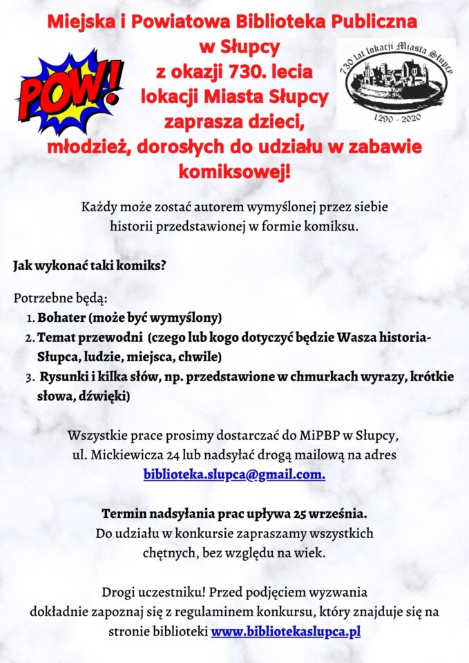 Miejska i Powiatowa Biblioteka Publiczna w Słupcy, z okazji 730. lecia lokacji miasta Słupcy, zaprasza wszystkich chętnych (bez względu na wiek) do udziału w zabawie komiksowej. Przedmiotem zabawy – konkursu jest stworzenie komiksu o tematyce związanej z nazwą konkursu „Słupca: ludzie, miejsca, chwile”. Na laureatów czekają pamiątkowe dyplomy oraz nagrody.