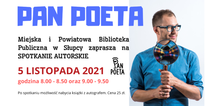 5 listopada o godz. 8.00 (pierwsze spotkanie) i 9.00 (drugie spotkanie) przygotowaliśmy gratkę dla dzieci w wieku 5-7 lat. Pan Poeta Show to angażujące uczestników spotkanie autorskie pełne śmiechu, rekwizytów, ruchu, kolorów i dobrej zabawy.