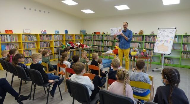 Cóż to było za spotkanie! Wszystko działo się za sprawą Pana Poety. Był śmiech, wesoła zabawa i duuużo humoru. Pierwszoklasiści ze Szkoły Podstawowej nr 1, Wiewiórki i Stokrotki z Przedszkola „Miś” oraz nasi mali czytelnicy mogli osobiście poznać bohaterów książek Pana Poety. Uczestniczyli w autorskich warsztatach z kreatywnymi zabawami: karmiły pluszową kurę zdrową żywnością, tworzyły nowy ogon dla pawia, próbowały okiełznać szumiące morze pełne balonów, przebierały się w kolorowe stroje, podobnie jak kaczka, co przebrała miarkę.