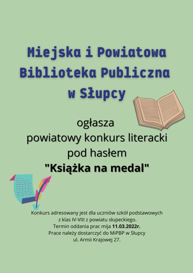 4.Prace należy dostarczyć do Miejskiej i Powiatowej Biblioteki Publicznej w Słupcy ul. Armii Krajowej 27, 62-400 Słupca lub przesłać na adres mailowy  wypozyczalnia.bibliotekaslupca@gmail.com