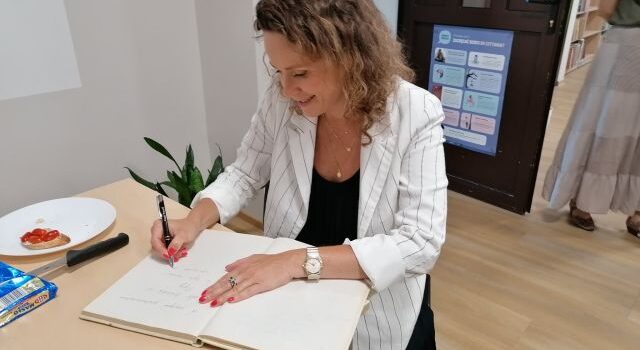 przy brązowym stole na siwym krześle siedzi kobieta w białej marynarce i czarnej sukience i wpisuje się do białej księgi