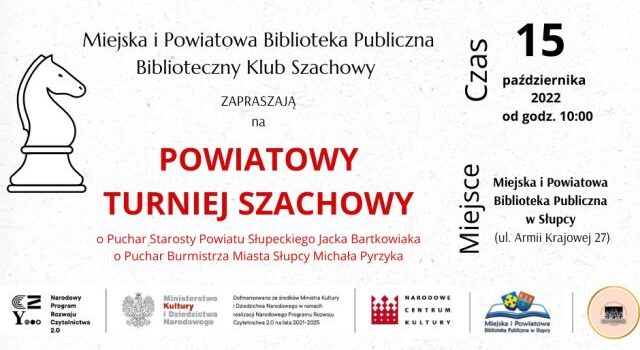 Wspólnie z Bibliotecznym Klubem Szachowym zapraszamy 15 października od godz. 10:00 na Powiatowy Turniej Szachowy o Puchar Starosty Powiatu Słupeckiego Jacka Bartkowiaka i o Puchar Burmistrza Miasta Słupcy Michała Pyrzyka.