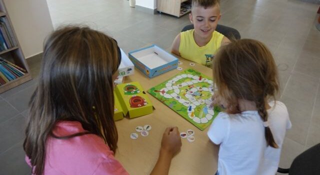 przy brązowym stole siedzą dzieci, na stole leżą gry planszowe