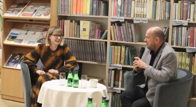 kobieta w sukience w żółto czarne pasy siedzi przy stoliku z jasnym obrusem, po drugiej stronie siedzi mężczyzna w siwej marynarce, w tle regały z książkami