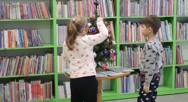 dziewczynka i chłopiec ubierają małą choinkę w wykonany przez siebie łańcuch, w tle regały z książkami