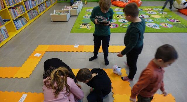 dzieci za pomocą tabletów sterują robotami, w tle regały z książkami