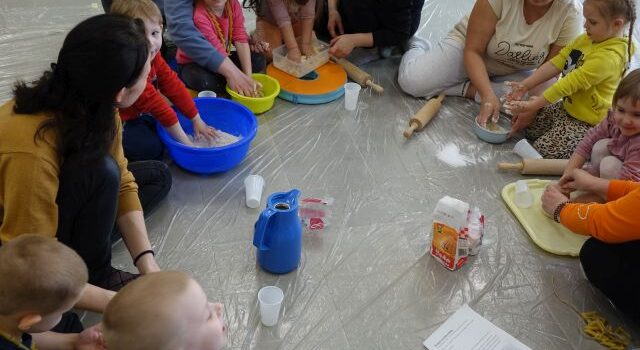 Na koniec postanowiliśmy zamienić sznurkowe ozdoby na coś „ekstremalnego”: w ruch poszły miski, wałki, foremki, no i oczywiście mąka, sól i woda. Trzeba było wyrobić ciasto na masę solną. Do pracy zaangażowali się mali i duzi. Z wyrobionego ciasta, przy użyciu foremek, powstawały różne kształty – serduszka, kółeczka i motylki. Tak wykonane prace poczekają do następnego spotkania. Wtedy to masa będzie odpowiednio twarda i przystąpimy do malowania i ozdabiania. Na zakończenie mali „bohaterzy” próbowali przejść ścieżką sensoryczną z pomiętych gazet, mchu, grochu i suszonej kory.