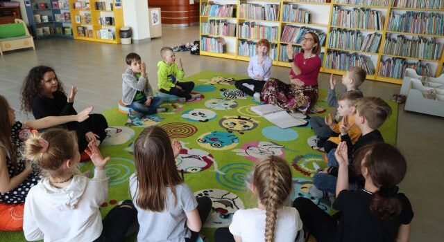 „Młodsza grupa” uczestników warsztatów realizowanych w ramach inicjatywy oddolnej „Z bajką na ustach”, prowadzonych przez Panią Arletę Adamczyk, 28 kwietnia rozpoczęła zajęcia ćwicząc oddech oraz aparat mowy. Dzieci wykonywały różne ćwiczenia przepony oraz języka.