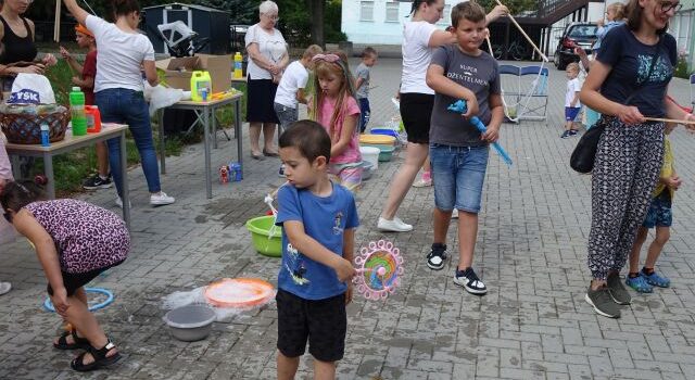 Zabawa rozpoczęła się o godzinie 10.00 na placu przy bibliotece. Dzieci, które wzięły udział w zajęciach, te mniejsze i te większe, chętnie wciągnęły się w bańkowe zabawy. Za pomocą różnych przyrządów, nawet własnej produkcji, tworzyły bańki, łapiąc, zbijając, goniąc i podziwiając mieniące się różne ich kształty w słońcu. Na nudę nie było czasu. Ich oczy lśniły z ekscytacji, gdy zobaczyły, jak bańki powstają w różnych kształtach i rozmiarach. Wraz z rodzicami i opiekunami, którzy chętnie dołączyli do zabawy, maluchy tworzyły kolorowe bańki, które unosiły się w powietrzu niczym tęczowe marzenia.
