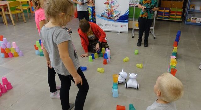 Następnie wszyscy wspólnie zbudowaliśmy kubeczkowe miasteczko z parkingami, wieżami i mostami, które okazało się świetnym labiryntem dla naszych robotów. Każdy miał okazję sterować robotem w taki sposób, aby nasze miasteczko nie zostało uszkodzone.