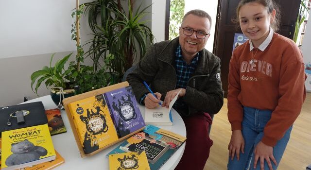 pisarz podpisuje się młodzieży na kartkach