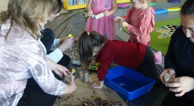 Jesień to niezwykle kolorowa pora roku, dlatego na zajęciach w Klubie Malucha Kangurek chętnie nawiązujemy do spadających liści, darów jesieni i zmieniającej się pogody. Bohaterką środowego spotkania (18.10.) była sowa. Mali i duzi uczestnicy wysłuchali opowiadania Pana Poety pt. Sowa co bałagan ma w porządku, a następnie stworzyli jesienne sowy z rolek po papierze toaletowym i pokruszonych liści, ćwicząc tym samym małą motorykę.