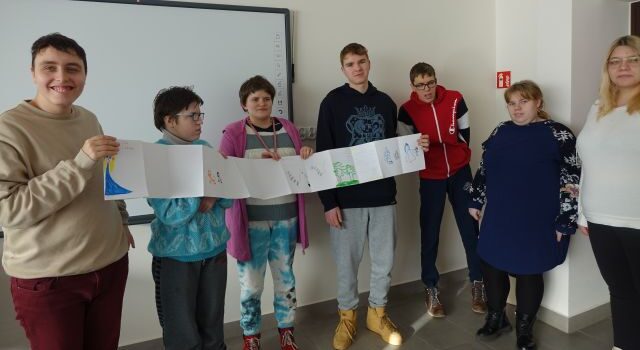 Spotkanie było nie tylko edukacyjne, ale również kreatywne i angażujące! Młodzież miała okazję wspólnie stworzyć harmonijkową książkę, gdzie każdy uczestnik dodał swoją autorską opowieść w formie rysunku. Połączenie ich prac stworzyło piękną i unikalną harmonijkę.