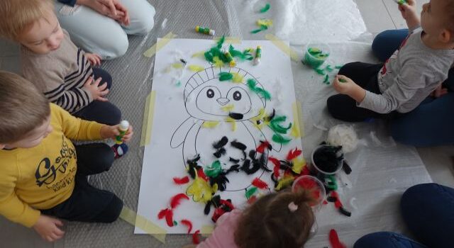 Dzięki tym wspaniałym chwilom stworzyliśmy w naszej bibliotece naprawdę zimową atmosferę. Po takiej radosnej zabawie, w duchu zbliżającego się Dnia Pingwina, wspólnie z maluchami pokolorowaliśmy piórkami dekoracyjnymi uroczego pingwinka. Ta kreatywna aktywność nie tylko rozwijała wyobraźnię, ale również doskonale ćwiczyła małe rączki, pobudzając zmysły naszych najmłodszych czytelników.