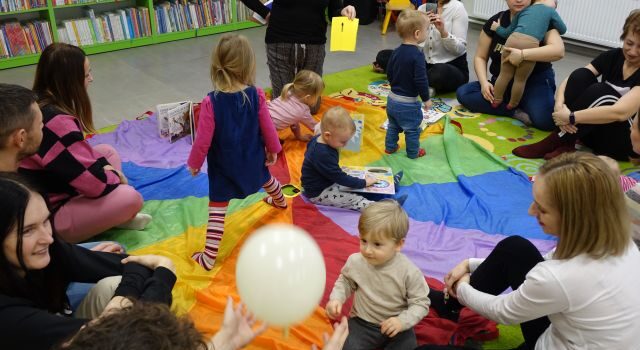 Nie zabrakło także emocjonującej zabawy chustą animacyjną! Maluchy najpierw doskonaliły swoje umiejętności rozpoznawania kolorów i ich nazw, korzystając z książeczki Basia, Franek i kolory. Następnie przeszliśmy do testu zręczności i celności, próbując celnie trafiać piłeczkami w środek chusty. To było wyzwanie, ale dzięki pomocy rodziców dzieci świetnie sobie poradziły!