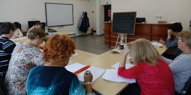 seniorki siedzą przy stołach i notują na kartkach