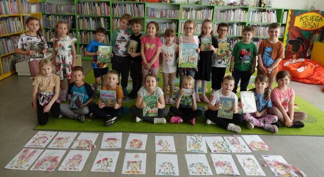 dzieci pozują do zdjęcia w dwóch rzędach siedząc i stojąc, przed nimi na podłodze prace twarzy pokolorowanych i wyklejonych kolorowymi papierami, w tle kolorowe regały z książkami