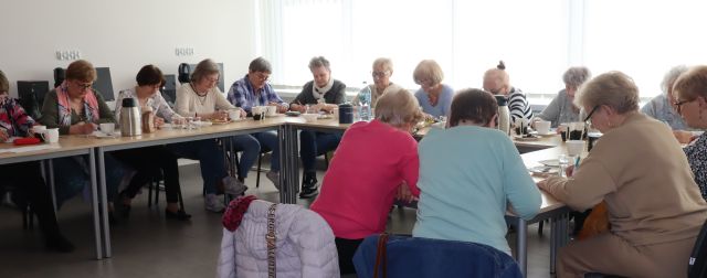 seniorki ćwiczą dłońmi siedząc przy stołach