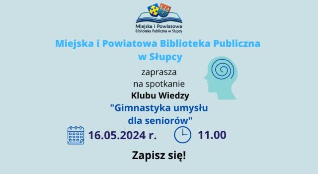 Czy wiesz, że troska o zdrowie umysłu jest równie istotna jak dbanie o kondycję fizyczną? Miejska i Powiatowa Biblioteka Publiczna w Słupcy 16 maja o godz. 11.00 serdecznie zaprasza Seniorów na wyjątkowe spotkanie w ramach Klubu Wiedzy, poświęcone tematowi Gimnastyka Umysłu dla Seniorów.