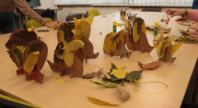 Podczas zajęć liście nie tylko zachwycały bogactwem barw, ale także wypełniły bibliotekę delikatnym, jesiennym zapachem, który wprowadził do wnętrza przytulną atmosferę. Spotkanie stało się okazją do wspólnej zabawy, kreatywności i cieszenia się urokami jesieni.