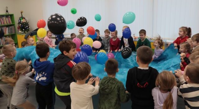 Spotkania miały wyjątkowo interaktywny charakter. Przedszkolaki nie tylko słuchały, ale aktywnie uczestniczyły w zabawie – tworzyły morskie fale z balonów, wybierały kolorowe okulary, a także puszczały pod sufit komety, które za każdym razem budziły ogromną radość. Sala biblioteki wypełniała się spontanicznymi okrzykami, śmiechem i twórczą energią.